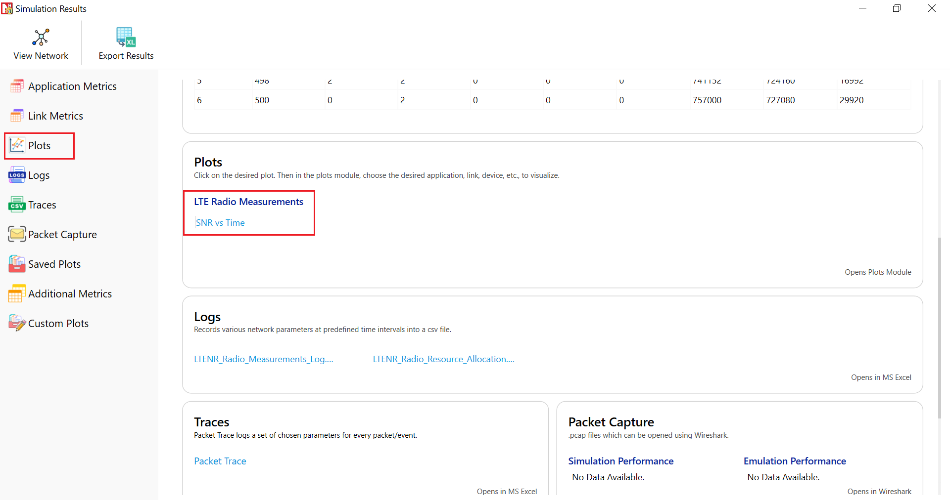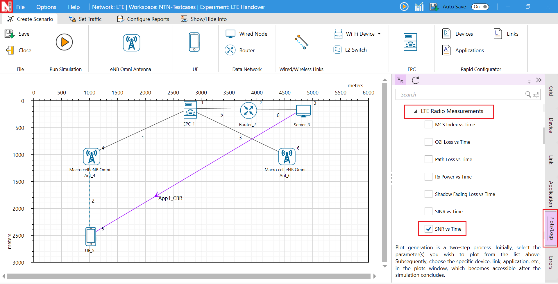 After the creating the scenario, click on Plots/Logs in right panel and under LTE NR Radio Measurements enable SNR vs Time plot and run the scenario