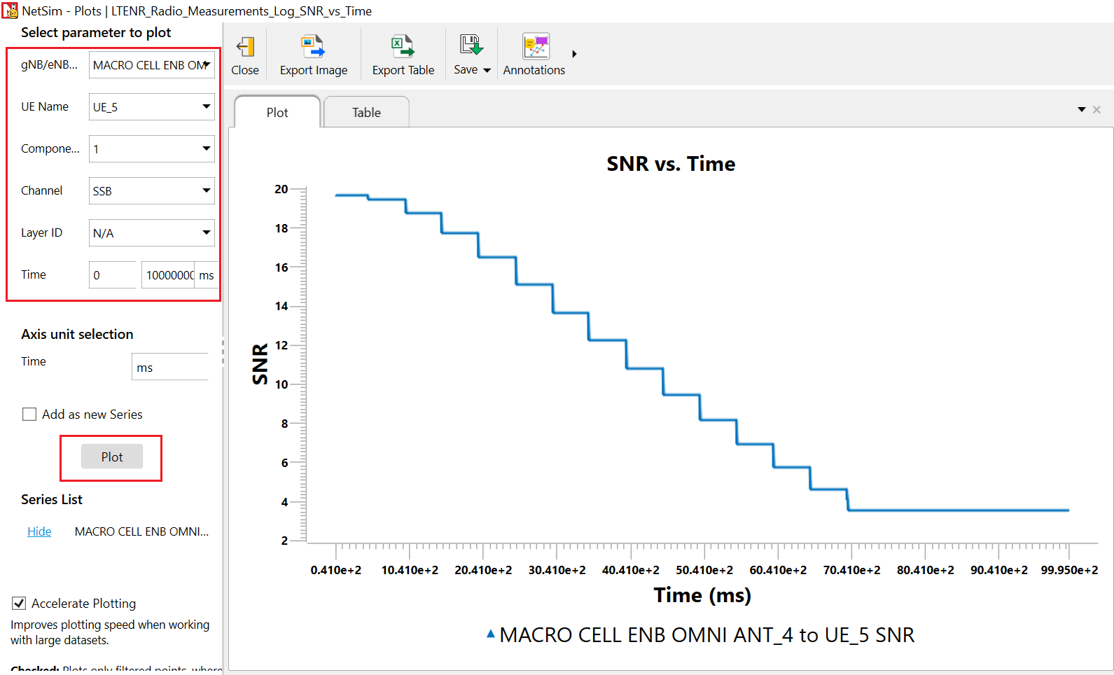 After the simulation, go to the simulation results and click on the SNR vs Time plot.