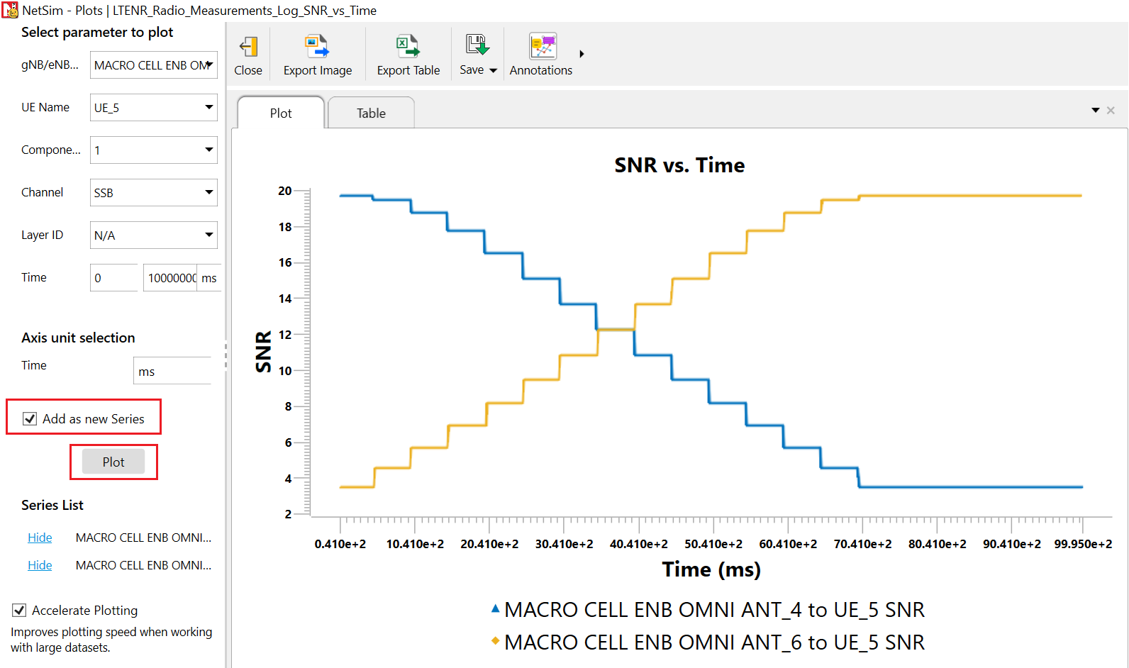 To additionally observe the SNR from other gNBs, select the corresponding gNB ID, click on Add as New Series, and then plot.