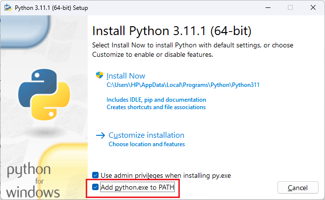 - While installing python, make sure that the Add python.exe to PATH checkbox is enabled as shown below: