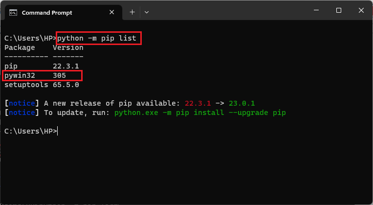 - Open the Command prompt and execute the command python -m pip list to check if pywin32 is installed as shown below: