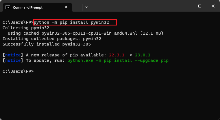 - If pywin32 package is not installed, install it by executing the command python -m pip install pywin32 in the command prompt