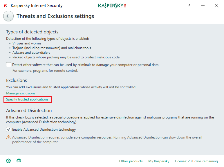 Step 8: Now click on "Specify Trusted Application" next to Manage Exclusion