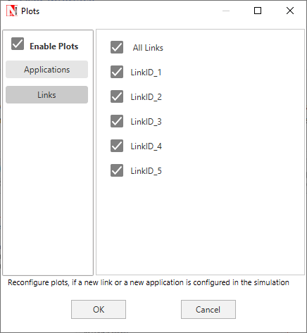 - By default, all links and applications that are configured in the network will be selected. Users can choose to modify the selection to obtain plots only for specific links/applications. Click on ok after making changes if any to enable Plots.