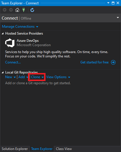 In Team Explorer, under the Local Git Repositories section, choose the Clone command