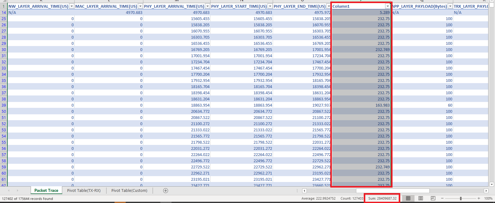 4. Calculate the Transmission time using the formula Phy_Layer_End_Time - Phy_Layer_Start_Time and note down the sum of Transmission time for the packets filtered.