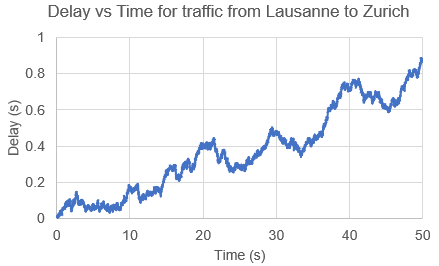 Fig 16: Delay vs Time plot for traffic from Lausanne to Zurich servers.