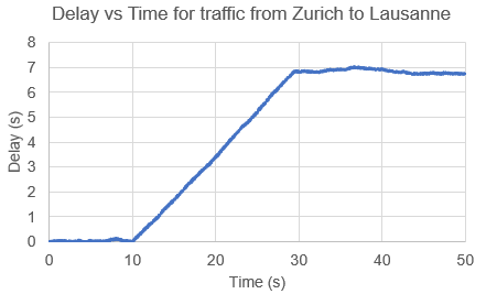 Latency starts spiking up at the 10th second when the Basel – Zurich link fails. Prior to the 10th second, the average delay is ~51 ms, and post the 10th second the average delay shoots up to ~5025 ms (or 5 seconds)