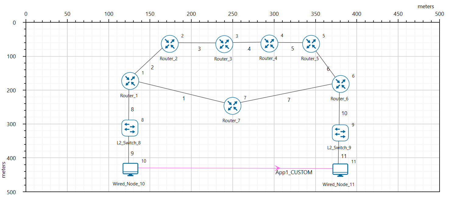 Let us consider the inbuilt experiment on Route Table formation in RIP and OSPF that comprises 7 Routers, 2 Switches, and 2 Wired nodes as shown below: