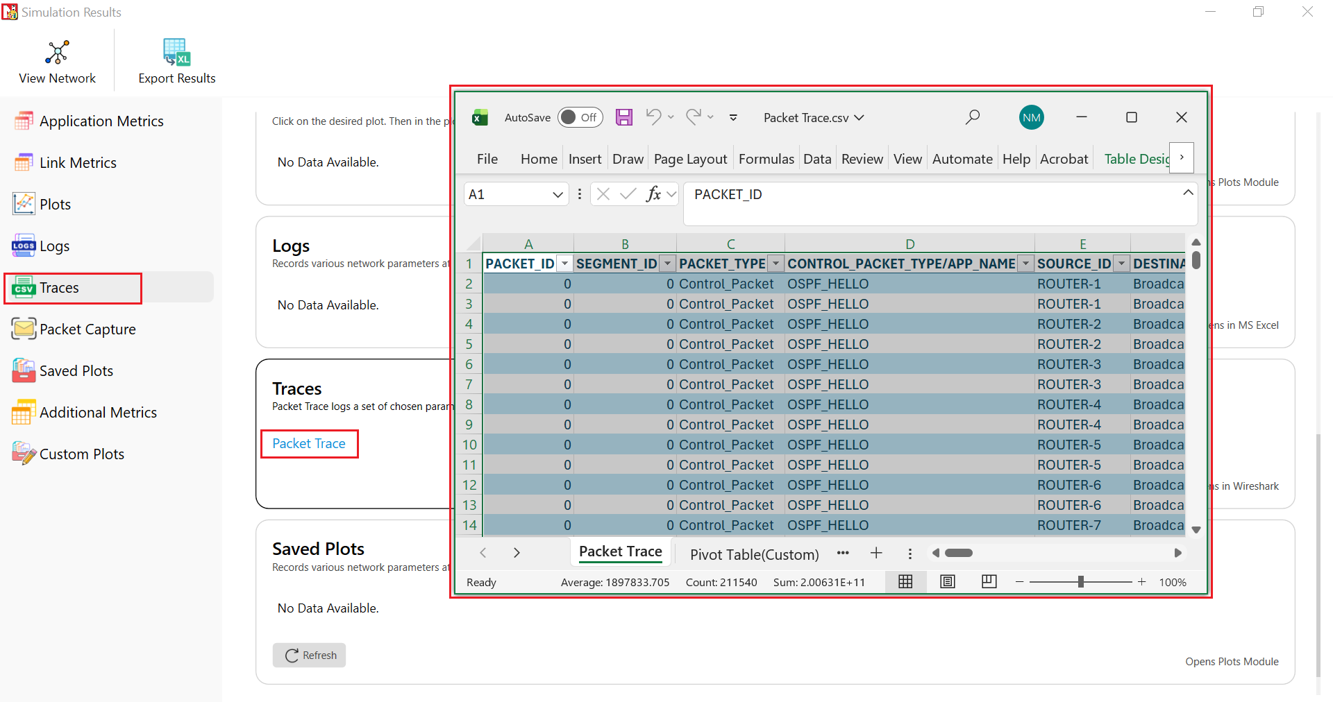 NetSim automatically formats the Packet Trace log file adding an auto-generated pivot table sheet and an empty custom pivot table sheet.