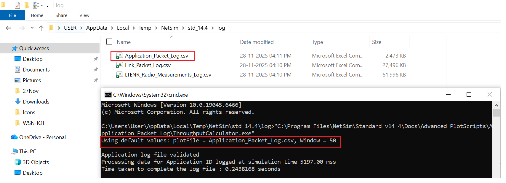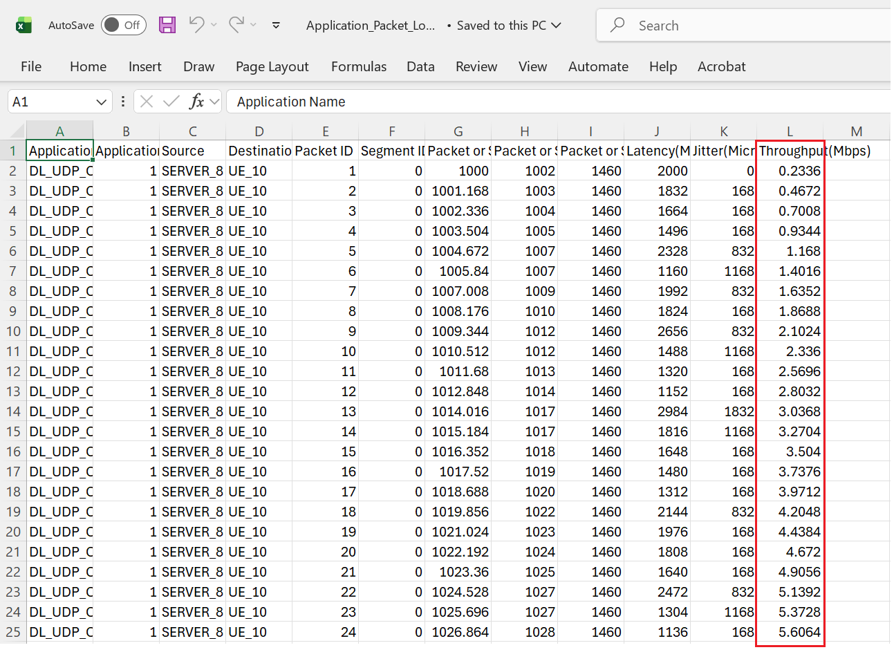 3. Open the Application_Packet_Log.csv and observe the computed throughput results.