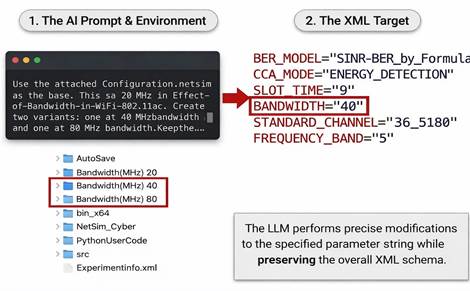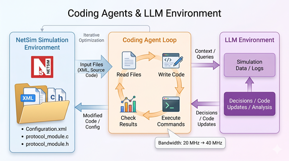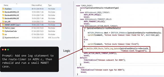 An AI agent with terminal access can run NetSim simulations directly. This is the workflow: