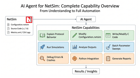 - Command-line interface. NetSim simulations can be run from the terminal using NetSimCore.exe. This is what makes AI-driven automation practical. The agent does not need to click through a GUI. It constructs a command, runs it, and reads the output.
