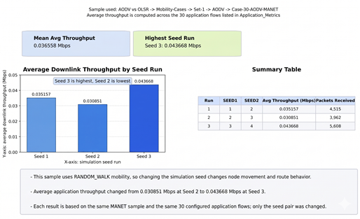 Run the MANET AODV mobility sample three times with simulation seeds 1, 2, and 3. For each run, extract the average application throughput from `Metrics.xml` and provide a summary table and a clean comparison image.