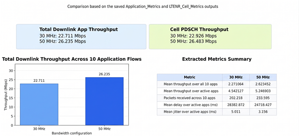You can sweep over any parameter: bandwidth, number of UEs, mobility speed, scheduling algorithm, propagation model, simulation duration. The agent handles the file manipulation and command execution. You read the summary.